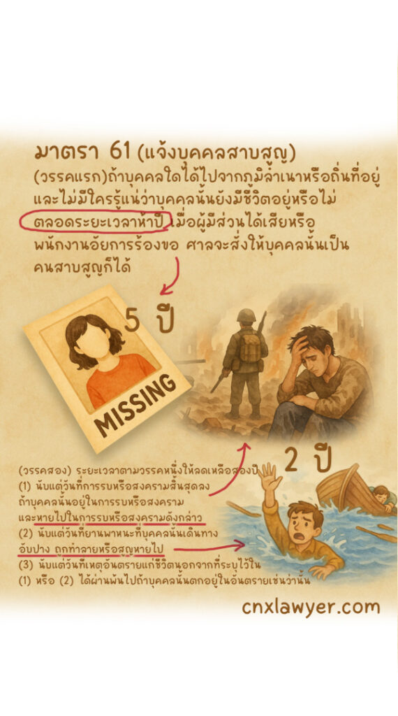 📌 การอ่านมาตรา 61 พร้อมยกตัวอย่างสถานการณ์จริง เช่น หายตัวในเหตุการณ์พิบัติ จะช่วยทำให้ตอบข้อสอบได้ละเอียดและได้คะแนนเต็ม